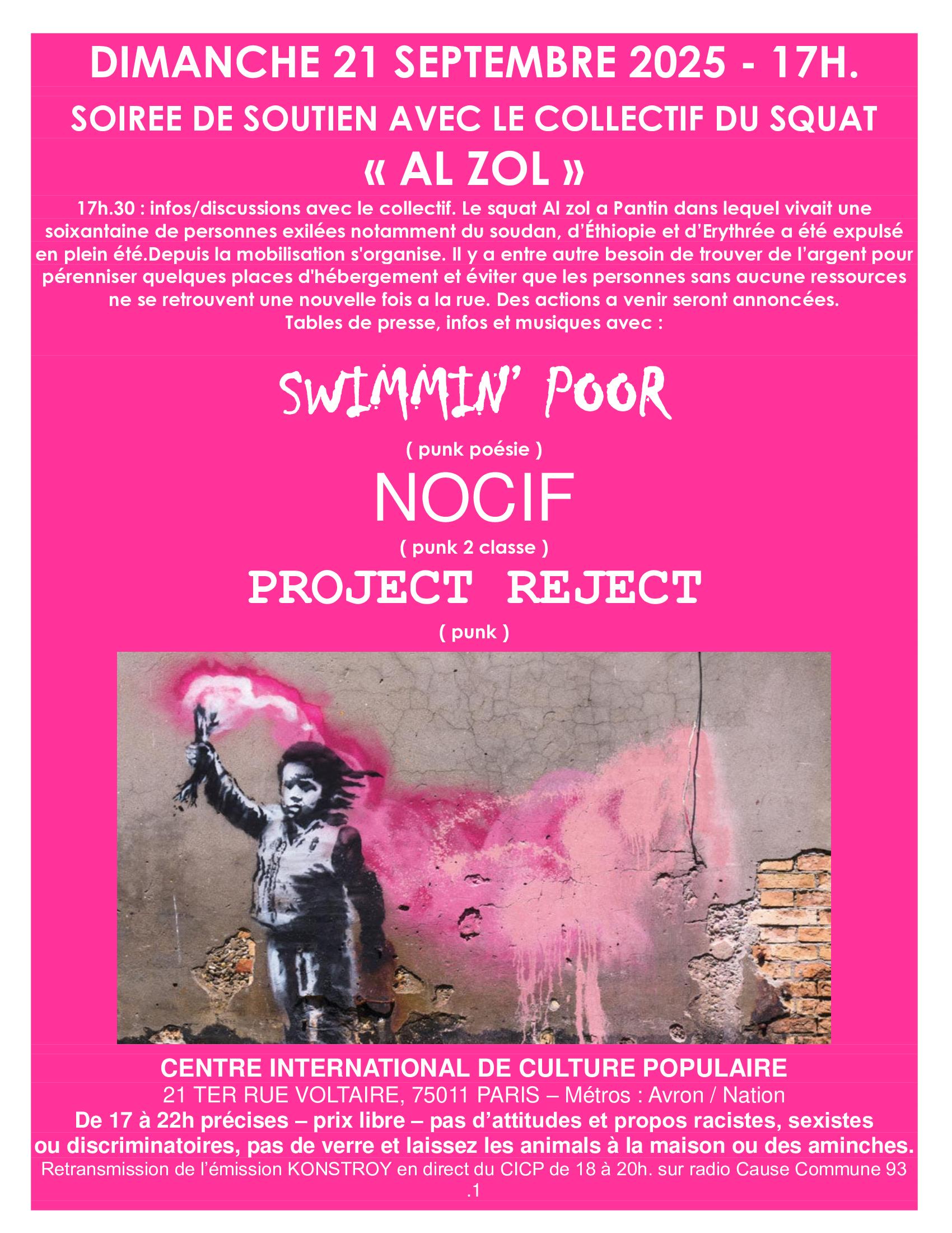 17h.30 : infos/discussions avec le collectif. Le squat Al zol a Pantin dans lequel vivait une soixantaine de personnes exilées notamment du soudan, d’Éthiopie et d’Erythrée a été expulsé en plein été.Depuis la mobilisation s’organise. Il y a entre autre besoin de trouver de l’argent pour pérenniser quelques places d’hébergement et éviter que les personnes sans aucune ressources ne se retrouvent une nouvelle fois a la rue. Des actions a venir seront annoncées.